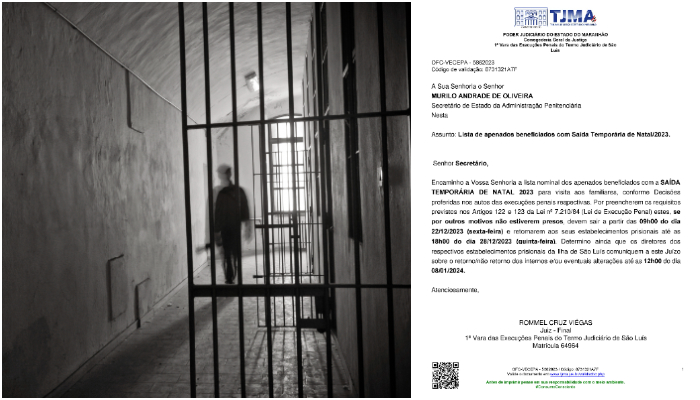 O juiz titular da 1ª Vara de Execuções Penais da Comarca da Ilha de São Luís, Rommel Cruz Viégas, encaminhou ofício à Secretaria de Administração Penitenciária, autorizando a saída temporária de 773 apenados(as) do regime semiaberto para visita aos familiares em comemoração ao Natal. Os beneficiados e beneficiadas foram autorizados a sair às 9h do dia 22 de dezembro (sexta-feira), devendo retornar aos estabelecimentos prisionais até as 18h do dia 28 de dezembro (quinta-feira).