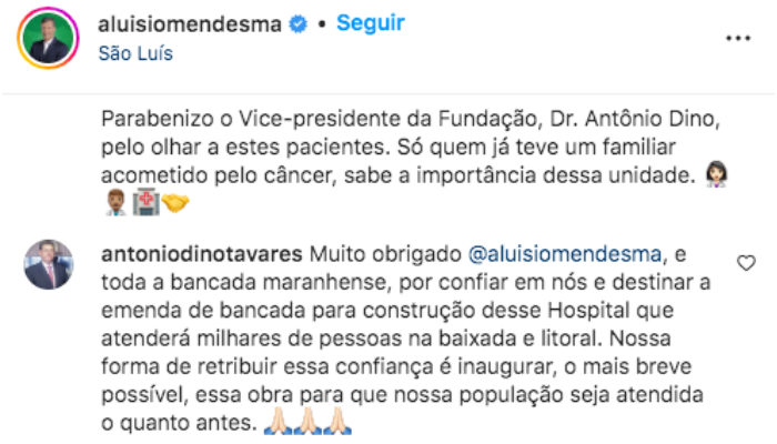 Antonio dino, Vice-presidente da Fundação, Dr. Antônio Dino, fez questão de agradecer também em sua rede social o empenho do deputado Aluisio Mendes. Muito obrigado @aluisiomendesma, e toda a bancada maranhense, por confiar em nós e destinar a emenda de bancada para construção desse Hospital que atenderá milhares de pessoas na baixada e litoral. Nossa forma de retribuir essa confiança é inaugurar, o mais breve possível, essa obra para que nossa população seja atendida o quanto antes.”