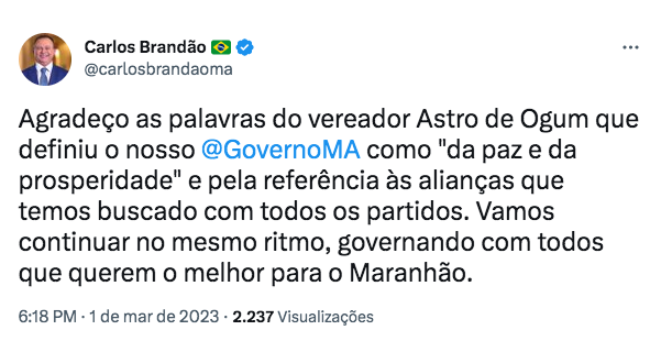 “Agradeço as palavras do vereador Astro de Ogum que definiu o nosso @GovernoMA como “da paz e da prosperidade” e pela referência às alianças que temos buscado com todos os partidos. Vamos continuar no mesmo ritmo, governando com todos que querem o melhor para o Maranhão.”