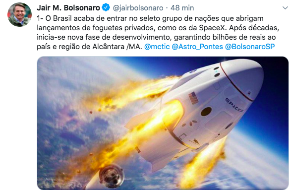A ideia é atrair empresas para atuar na base de Alcântara, no Maranhão. Nas redes sociais, o presidente Jair Bolsonaro disse que este é o começo de uma nova fase de desenvolvimento, que vai garantir bilhões de reais ao país e à região de Alcântara. “O Brasil acaba de entrar no seleto grupo de nações que abrigam lançamentos de foguetes privados, como os da SpaceX. Após décadas, inicia-se nova fase de desenvolvimento, garantindo bilhões de reais ao país e região de Alcântara /MA”, afirmou Bolsonaro