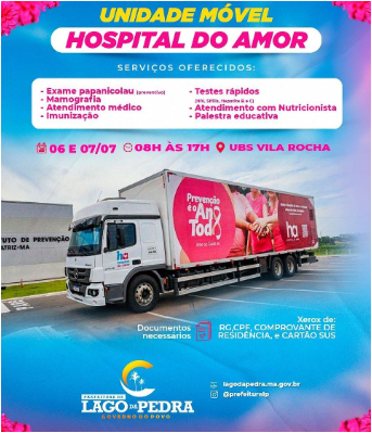 Em Parceria com a Prefeitura de Lago da Pedra, por meio da Secretaria Municipal de Saúde, a Carreta do Hospital de Amor, estará na cidade com o objetivo de cuidar da saúde da mulher lagopedrense, cujo atendimento terá início nesta quarta-feira,06 e quinta-feira,07de julho.