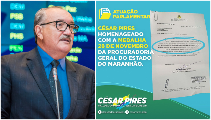 A PGE/MA por decisão do Conselho Superior da Procuradoria Geral do Estado do Maranhão concedeu ao deputado César Pires a Medalha 28 de Novembro. A condecoração é a distinção máxima conferida pelo Conselho àqueles que tem um papel de destaque e relevantes serviços, uma homenagem justa e merecida ao deputado, pela sua atuação, César Pires representa o fortalecimento do Estado Democrático de Direito.