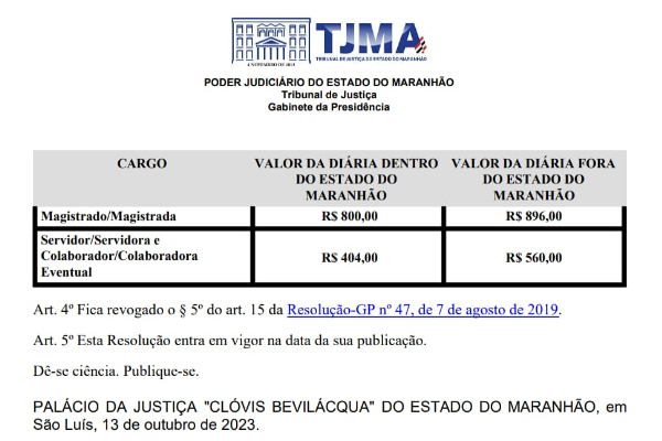 Para os magistrados, incluindo os desembargadores, o valor das diárias foi fixado em R$ 800,00 dentro do estado e R$ 896,00 fora do Maranhão.