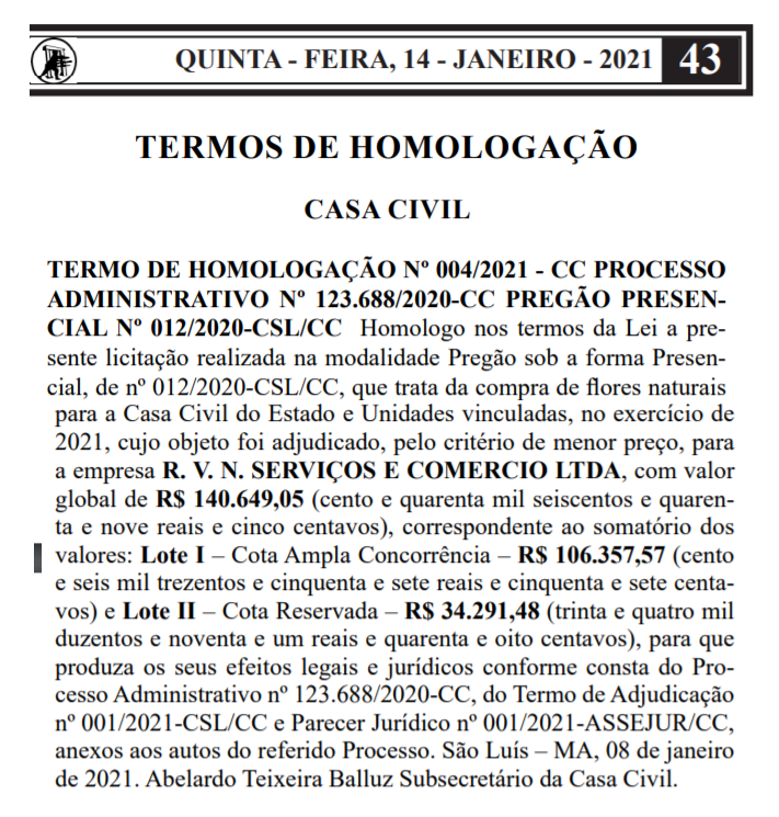 O termo de homologação do contrato firmado para a compra das flores foi publicado no Diário Oficial do Estado (DOE) no dia 14 deste mês, há exatamente uma semana. Confira abaixo: