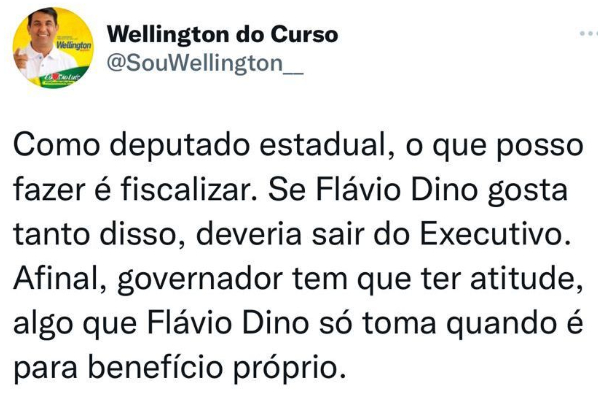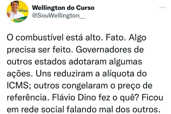 “Flávio Dino prefere ficar com ‘mimimi’ em rede social enquanto governadores de outros estados buscam soluções para diminuir o preço da gasolina. De fato, houve um reajuste pela Petrobras, mas os governos estaduais também podem agir, em vez de apenas ficar fazendo politicagem. Prova disso é o que governadores de outros estados, como DF e Rio Grande do Sul, fizeram. Uns reduziram a alíquota do ICMS, outros congelaram o preço de referência. E Flávio Dino? Faz o quê? Fica em rede social com ‘mimimi’, como se isso fizesse a diferença na vida de alguém. Eu sou deputado estadual. Infelizmente, não tenho o poder de reduzir o imposto. Só quem pode fazer isso é o governador, que infelizmente não tem dado a devida importância. Governador, reduza a alíquota do ICMS. É pelo bem do Maranhão”, afirmou o deputado Wellington.
