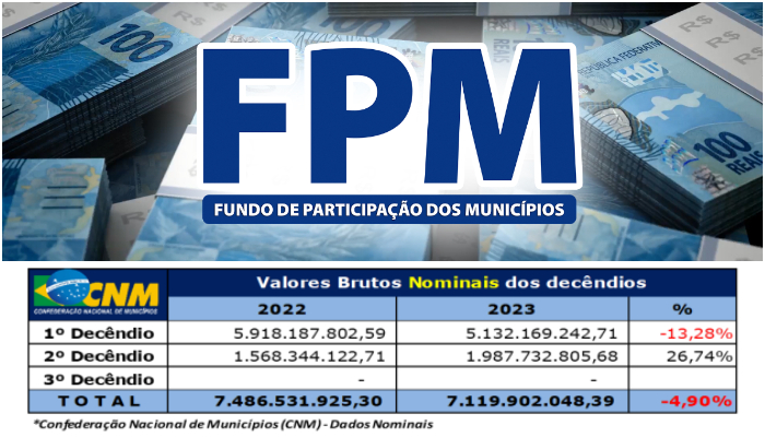O segundo decêndio do FPM deste mês é composto pela arrecadação do Imposto de Renda e Imposto Sobre Produtos Industrializados (IR e IPI) entre os dias 1º e 10, conforme dados disponibilizados pela Secretaria do Tesouro Nacional (STN). Em comparação com 2022, a transferência será 26,74% superior, resultado que reduz para 21,20% quando se considera a inflação.