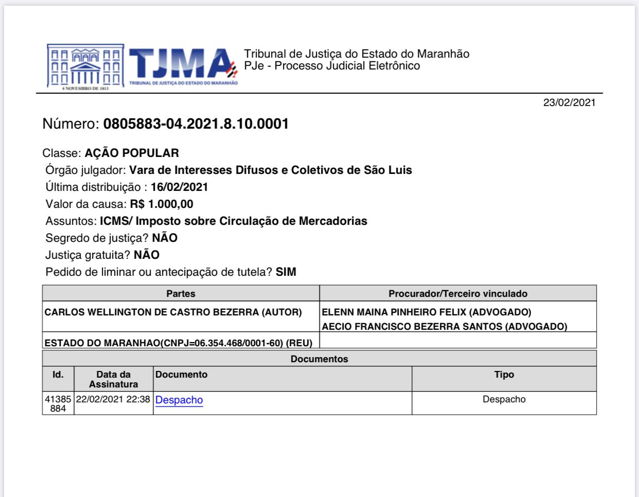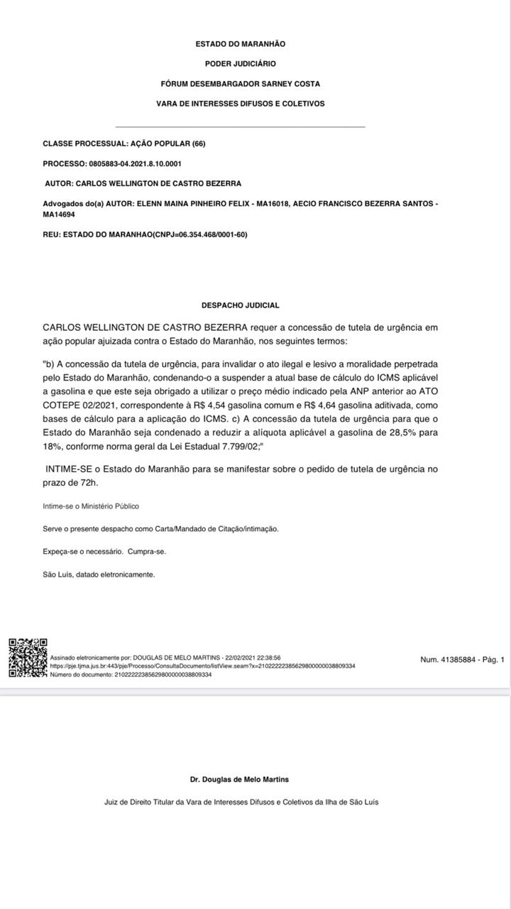 Na manhã desta terça-feira (23), o deputado estadual Wellington do Curso destacou despacho na Ação Popular n° 0805883-04, ajuizada por ele, que tem por objetivo reduzir a alíquota do Imposto de Circulação de Mercadorias e Prestação de Serviços – ICMS. O despacho foi dado pelo juiz Douglas Martins, da Vara de Interesses Difusos e Coletivos, e requer que o Estado do Maranhão e o Ministério Público se manifestem em até 72 horas.