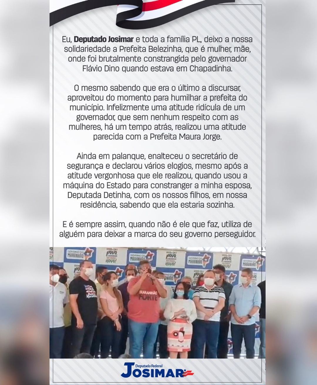 Ao emitir uma Nota de Solidariedade a prefeita de Chapadinha, que é do seu mesmo partido, Josimar afirmou que o governador humilhou a gestora, classificou como ridícula sua atitude e sem nenhum respeito com as mulheres.