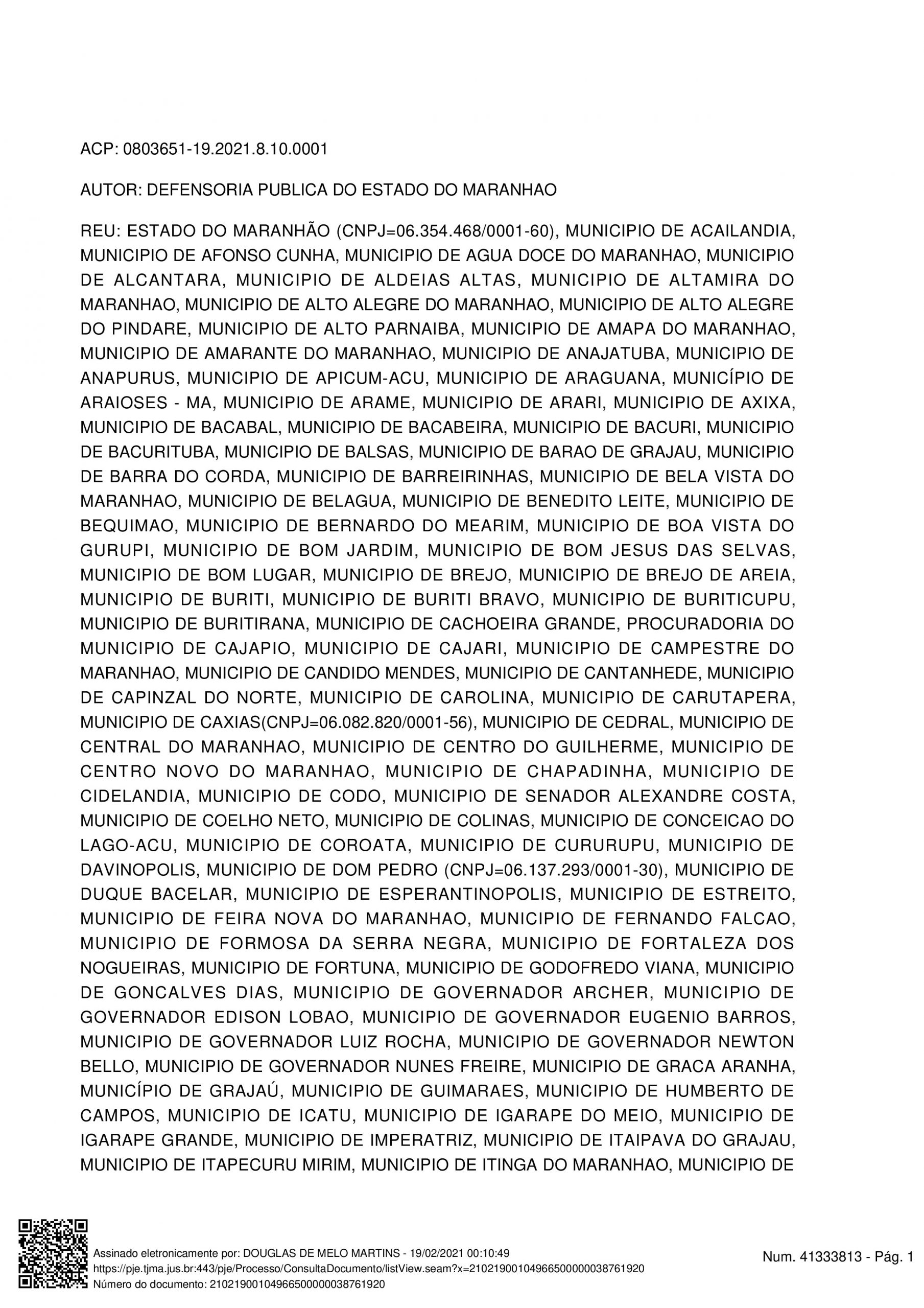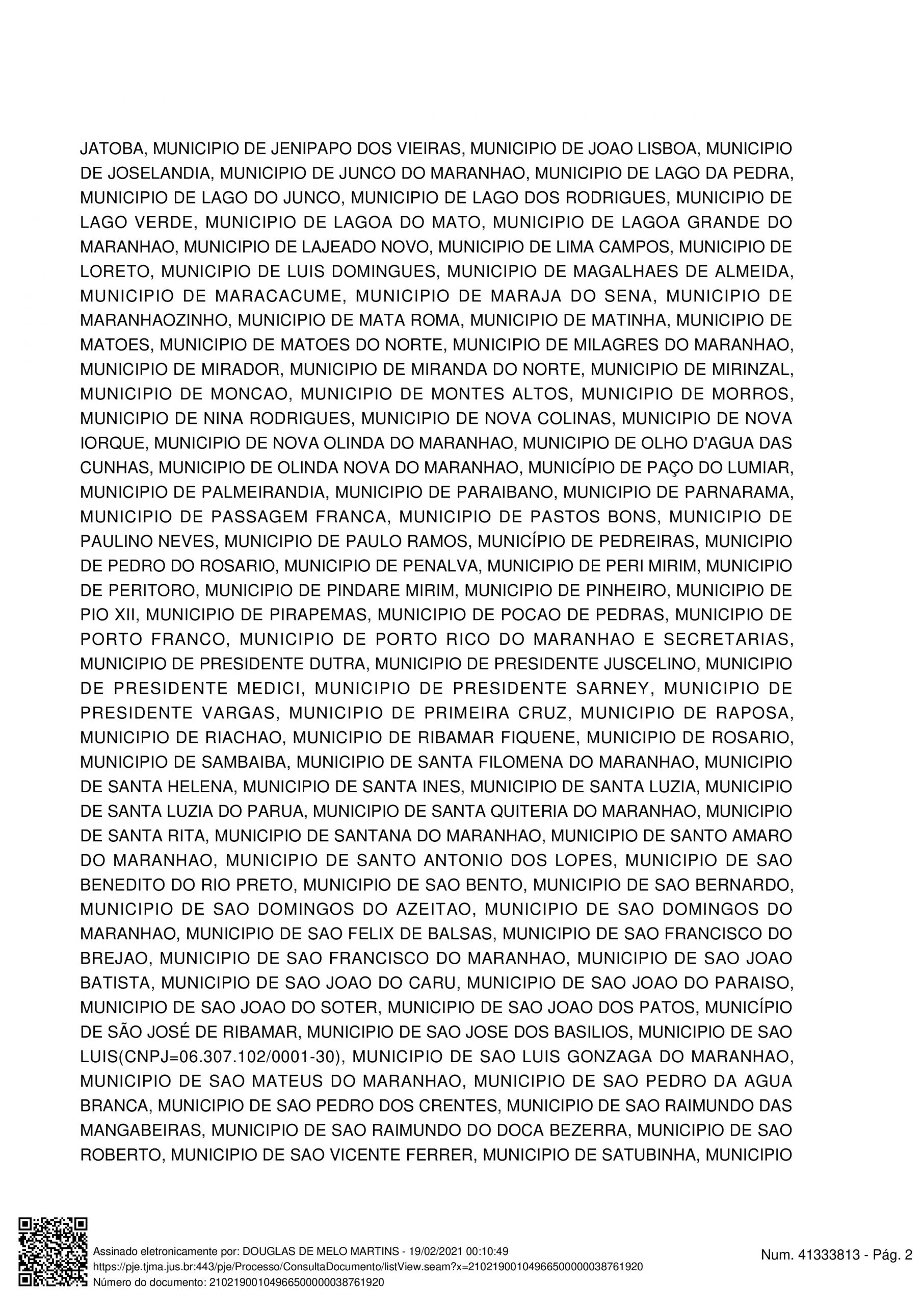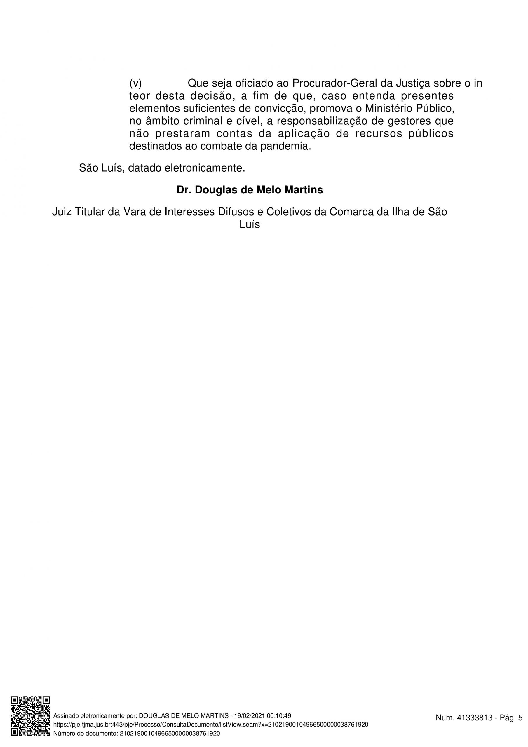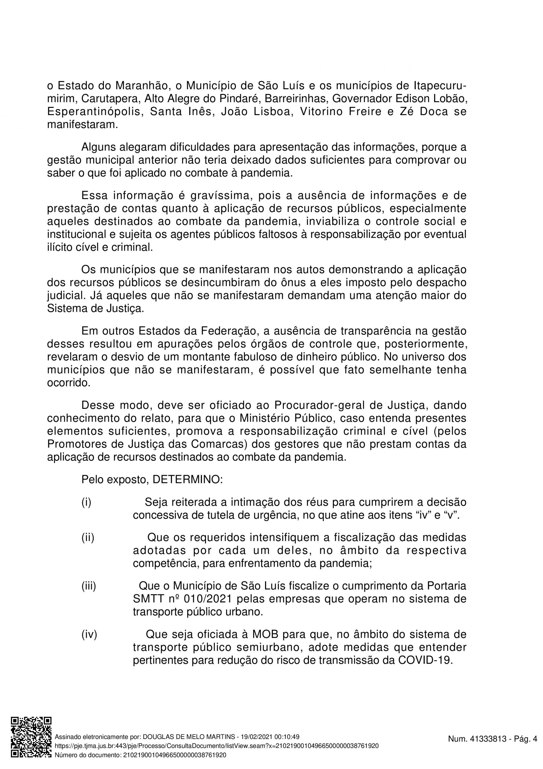 O magistrado determinou também que o estado e os municípios prestassem contas dos recursos de combate à pandemia estas prestações serão enviadas ao Procurador- Geral de Justiça. São 206 municípios maranhenses que não prestaram contas da aplicação de recursos públicos destinados ao combate à pandemia. Apenas o governo do estado e as prefeituras de São Luís, Itapecuru-mirim, Carutapera, Alto Alegre do Pindaré, Barreirinhas, Governador Edison Lobão, Esperantinópolis, Santa Inês, João Lisboa, Vitorino Freire e Zé Doca atenderam a intimação.
