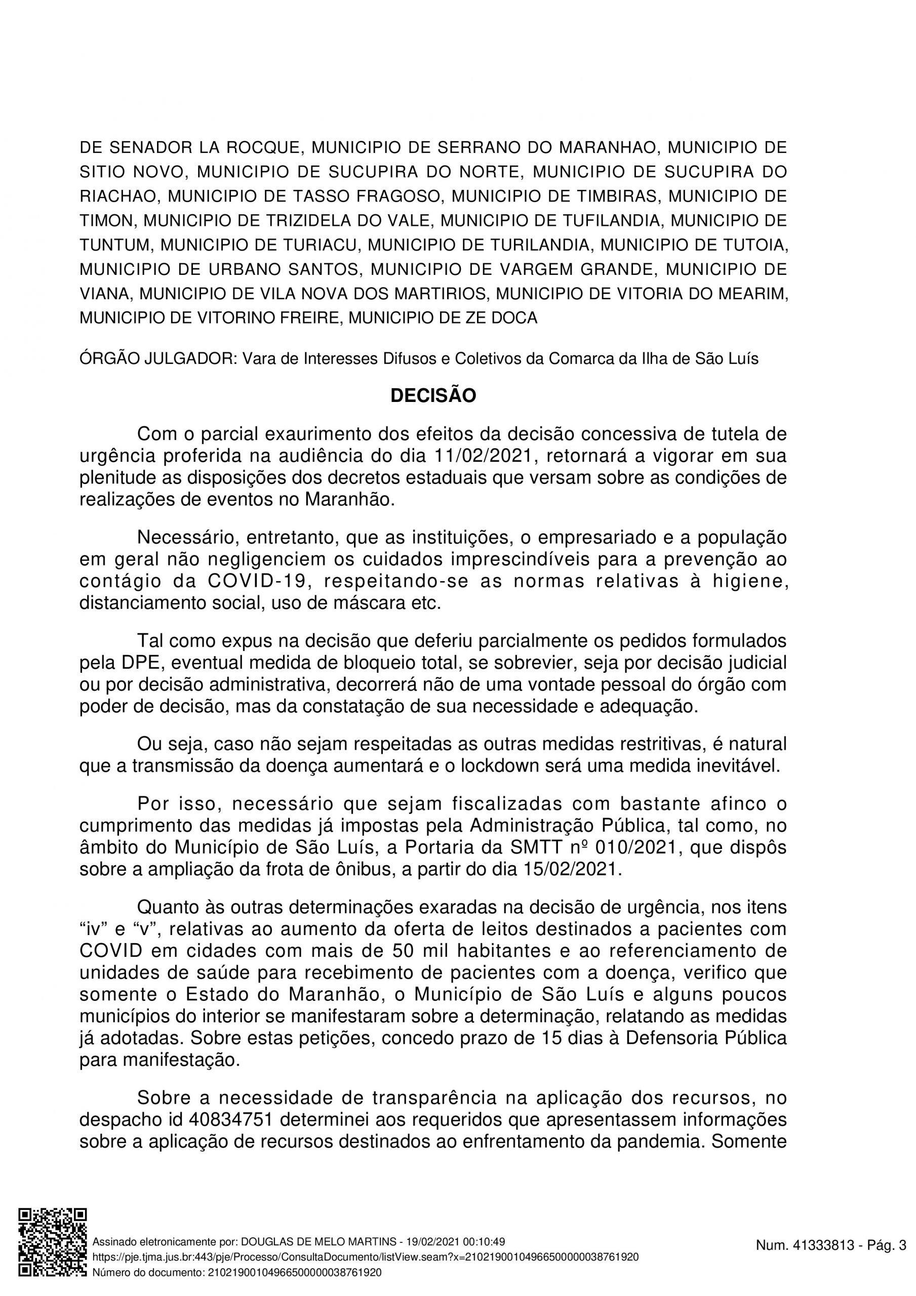 O juiz Douglas de Melo Martins, da Vara de Direitos Difusos e Coletivos da Ilha de São Luís, comunicou, no início desta manhã, o fim das medidas restritivas determinadas por ele para conter o avanço ainda maior da Covid-19 no Maranhão durante o pré-Carnaval e o Carnaval. Cessados os efeitos da decisão do magistrado, voltam a valer as regras estabelecidas pelo decreto estadual e pelos decretos municipais que impõem normas sanitárias para tentar conter a transmissão do novo coronavírus.
