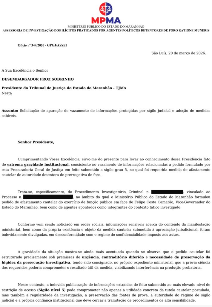 O Ministério Público do Maranhão informa que foi encaminhado, nesta sexta-feira, 20, ofício ao presidente do Tribunal de Justiça do Estado do Maranhão solicitando apuração de vazamento de informações protegidas por sigilo judicial, além da adoção das medidas cabíveis.