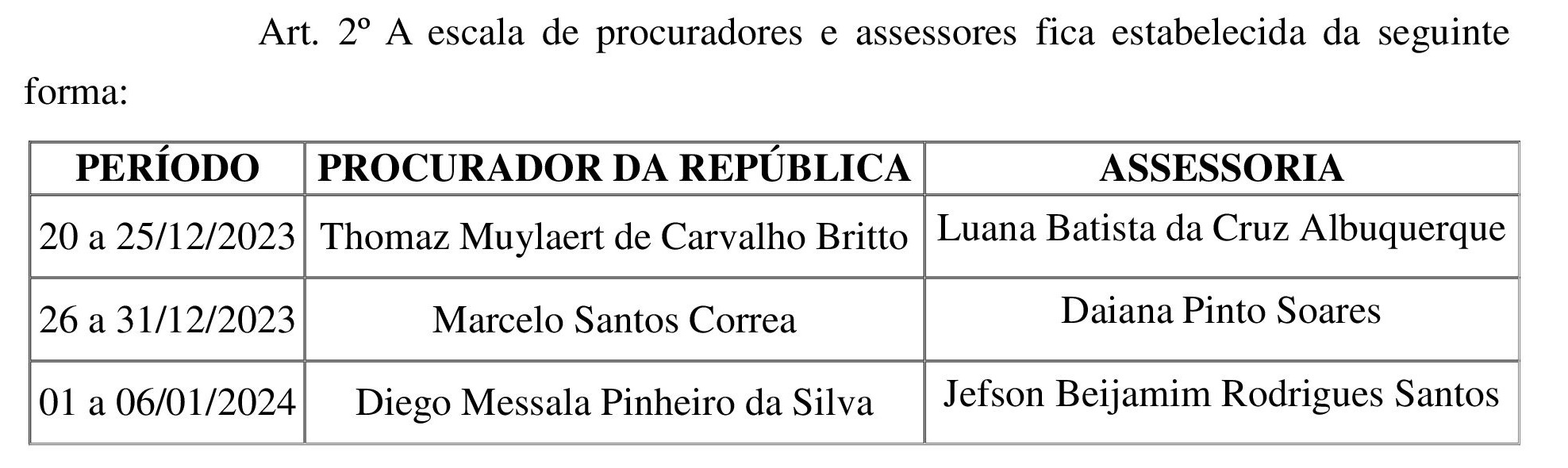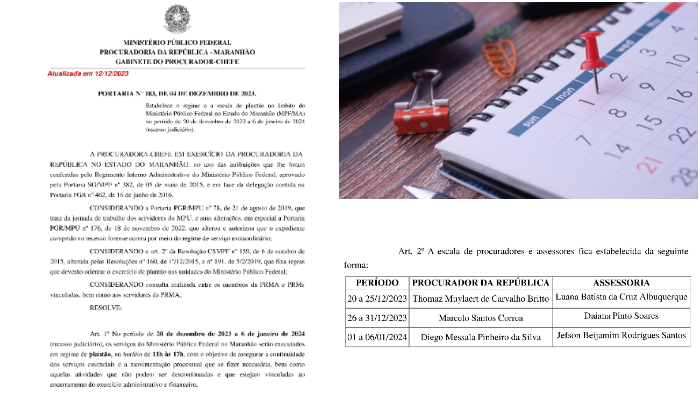 O Procurador da República Thomaz Muylaert Carvalho Britto e a servidora Luana Batista da Cruz Albuquerque estarão de plantão de 20 a 25 de dezembro. O Procurador Marcelo Santos Correa e a servidora Daiana Pinto Soares, de 26 a 31 de dezembro de 2023, e o Procurador Diego Messala Pinheiro da Silva e o servidor Jefson Beijamim Rodrigues Santos, de 1 de janeiro a 6 de janeiro de 2024. Durante o período, os procuradores responderão pela chefia da PR/MA.