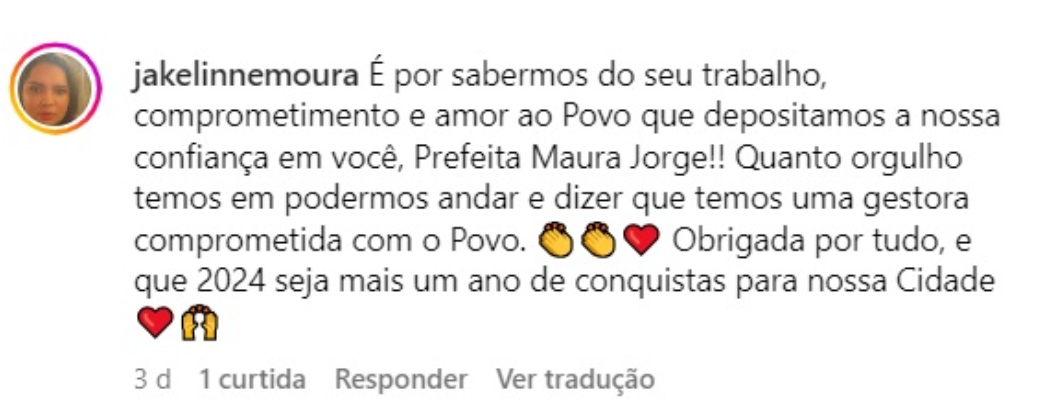 A população reconhece e parabeniza Maura Jorge por colocar Lago da Pedra nos trilhos do desenvolvimento. “É por sabermos do seu trabalho, comprometimento e amor ao Povo que depositamos a nossa confiança em você, Prefeita Maura Jorge!! Quanto orgulho temos em podermos andar e dizer que temos uma gestora comprometida com o Povo. Obrigada por tudo, e que 2024 seja mais um ano de conquistas para nossa Cidade.” afirmou a internauta Jakelinne Moura.