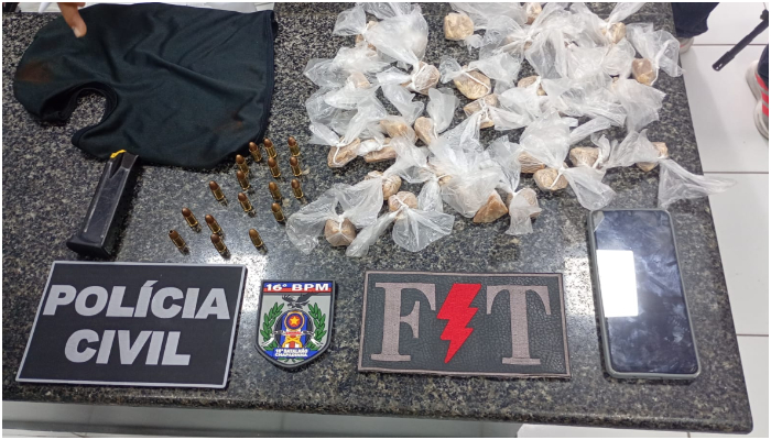 No momento da abordagem, os policiais apreenderam com os suspeitos uma balaclava, um jaquetão, carregadores, munições de arma de fogo e uma quantidade de substância entorpecente do tipo crack.