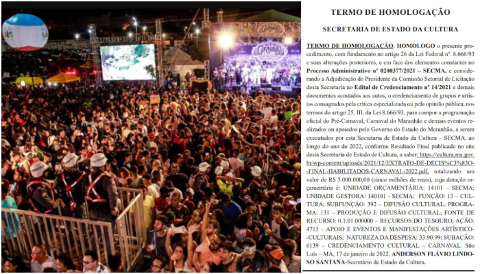 Um termo de homologação publicado na edição dessa quarta-feira (19) do Diário Oficial do Estado confirma a destinação de uma verba de R$ 5 milhões, via Secretaria de Estado da Cultura (Secma), para contratação de grupos e artistas “consagrados pela crítica especializada ou pela opinião pública” para animar o pré-Carnaval, o Carnaval e demais eventos realizados pelo Governo do Maranhão ao longo de 2022.