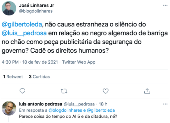 “Parece coisa do tempo do AI 5 e da ditadura, né?”, comentou Pedrosa, após uma provocação do jornalista Linhares Jr. no Twitter.