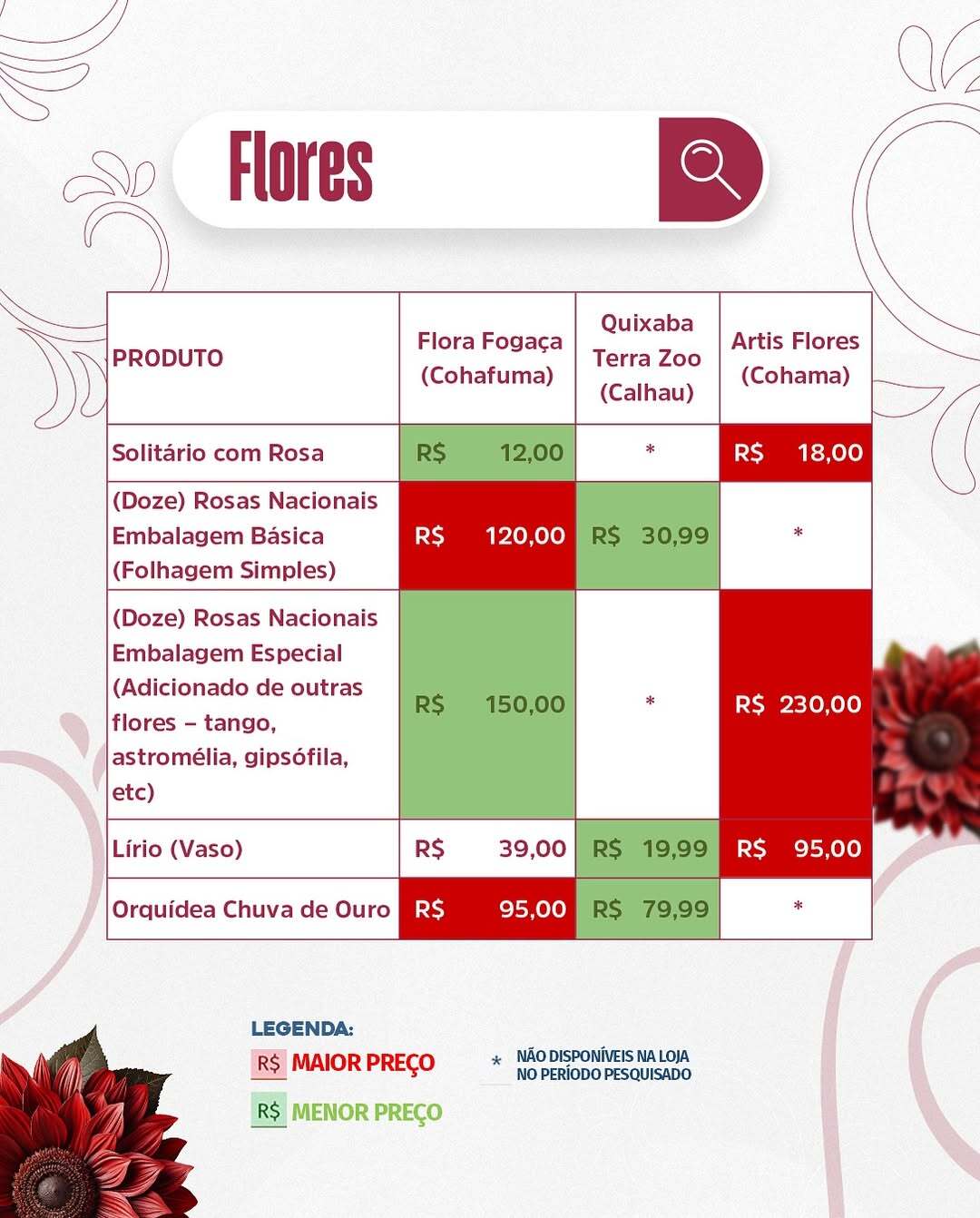 A maior variação registrada foi de 375,24% no item Vaso de Lírios, que custa R$ 95,00 na Artis Flores (Cohama) e R$ 20,00 na Flora Fogaça (Cohafuma).