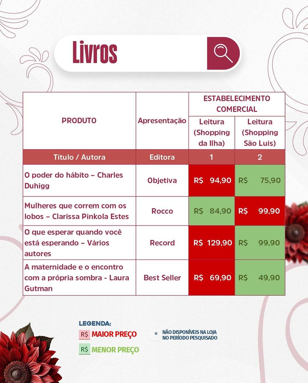 Entre os livros pesquisados, a maior variação de preço foi encontrada na obra A Maternidade e o Encontro com a Própria Sombra, da autora Laura Gutman. Na Livraria Leitura do Shopping da Ilha, o livro custa R$ 69,90, enquanto na mesma rede, no São Luís Shopping, o valor é R$ 49,90 — uma diferença de 40,08%.