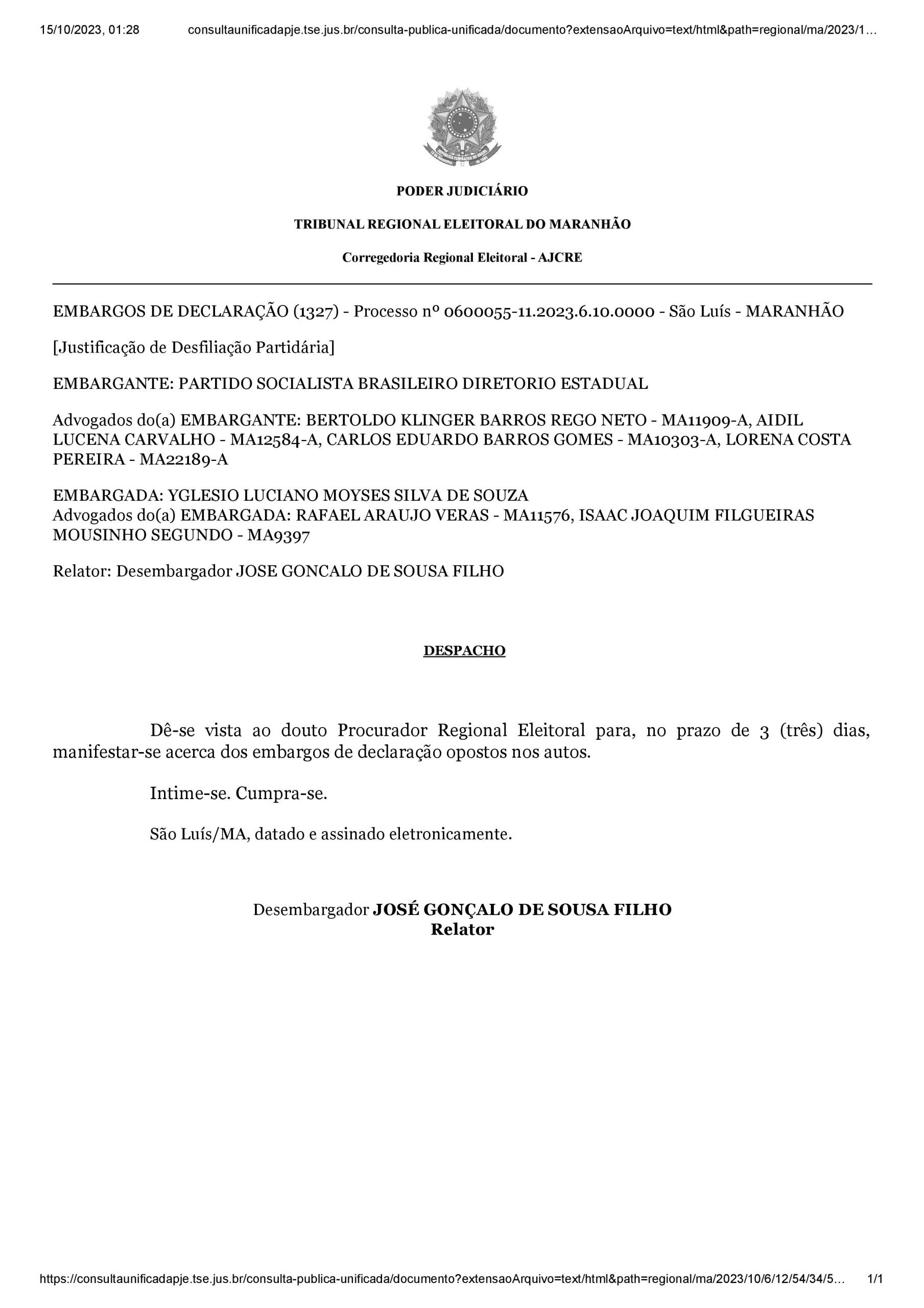 O PSB apresentou embargos de declaração à decisão do TRE-MA (Tribunal Regional Eleitoral) do Maranhão que liberou o deputado estadual Yglésio Moysés a se desfiliar da legenda. O recurso, que foi protocolado no dia 18 de setembro, tem a finalidade específica de esclarecer contradição ou omissão na decisão judicial.