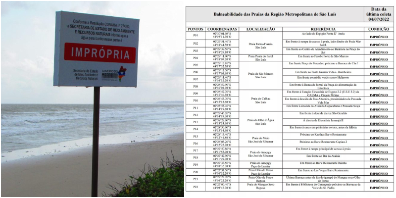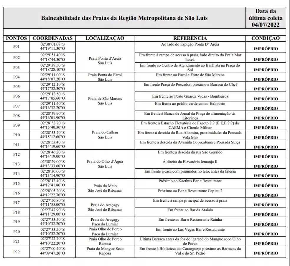 A Secretaria de Estado do Meio Ambiente e Recursos Naturais (Sema) divulgou um novo relatório de balneabilidade, classificando todas as praias de São Luís como impróprias para banho. Os relatórios acerca da situação das praias são atualizados semanalmente.
